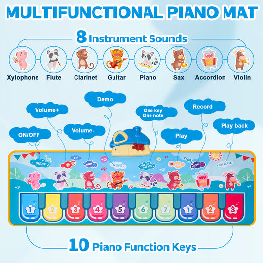Piano Mat for Toddlers, 39.5in Musical Keyboard Floor Playmat, 10 Pianp Keys, 8 Instrument Sounds, Montessori Toys Gifts for 1-3 Year Boy Girl for Birthday Christma