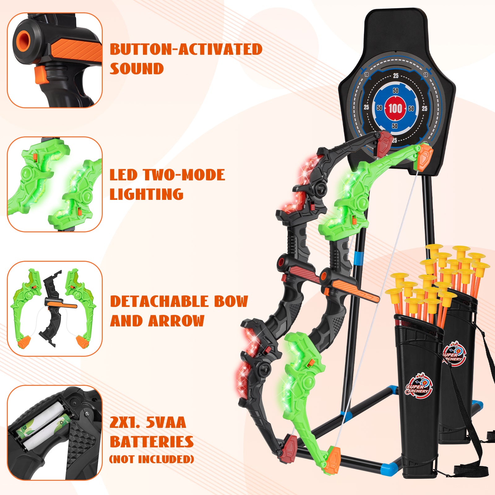 - By using the button on the handle, can effortlessly switch between two thrilling flashing modes, infusing a cool and captivating element into archery experience.The sound effects accompanied by the sound of the eagle add a different experience to the shooting experience. Our archery set with LED light stands out as a beloved choice among outdoor games for kids. Elevate your child's playtime with the archery set kids aged 10-12. Our LED bow that requires 2 AA batteries (not included).