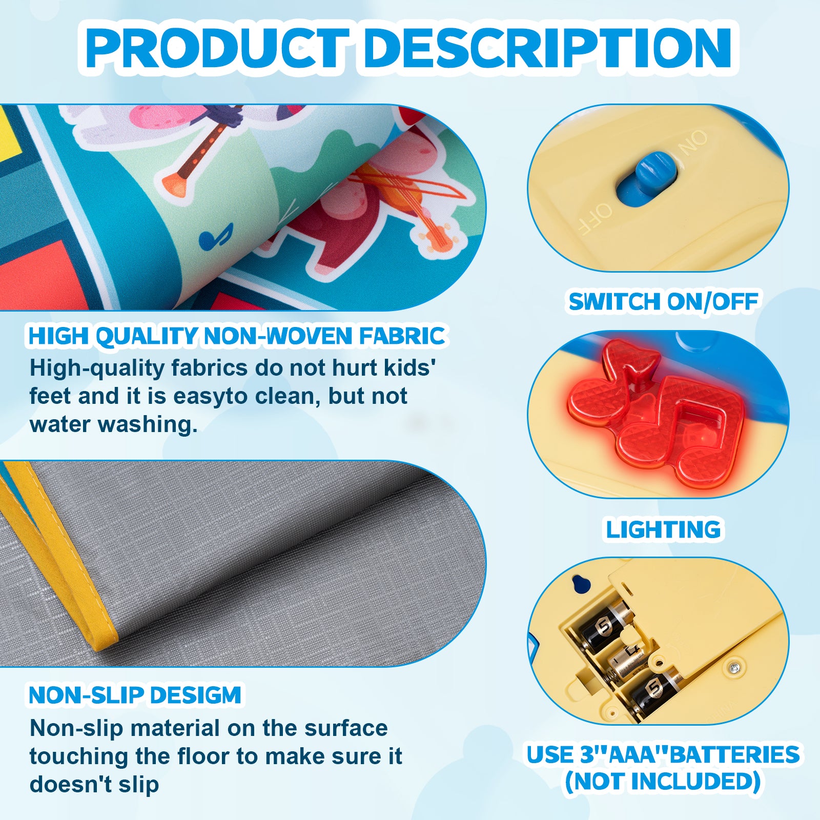 - Toxin-free and skin-friendly; made of high-quality padded material; durable enough for endless jumping and dancing; stain-resistant and easy to wipe clean. Mat size 39x14 inch, namely 100x36 cm, foldable to take it everywhere as a portable baby toy.